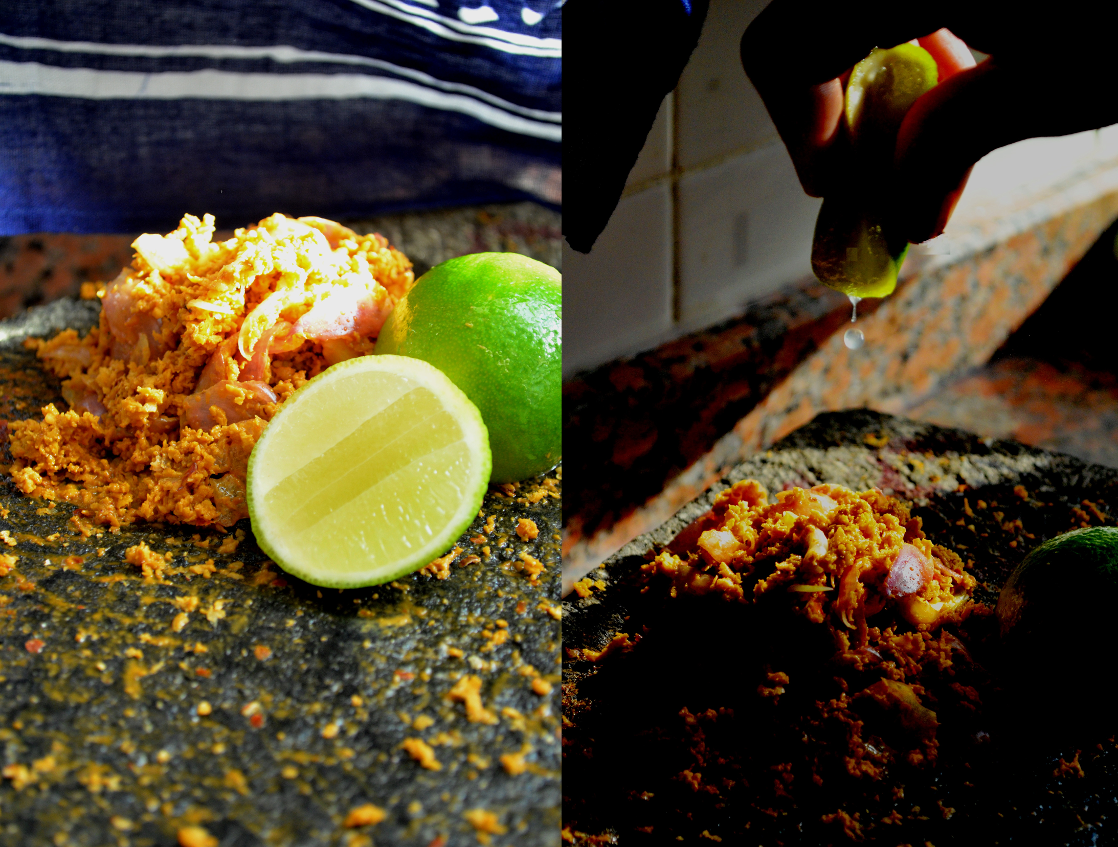 Put all the ingredients (except the lime juice) into a mortar and pestle and give it a good grind. Once all the ingredients are combined add a good squeeze of lime juice, mix well and serve.